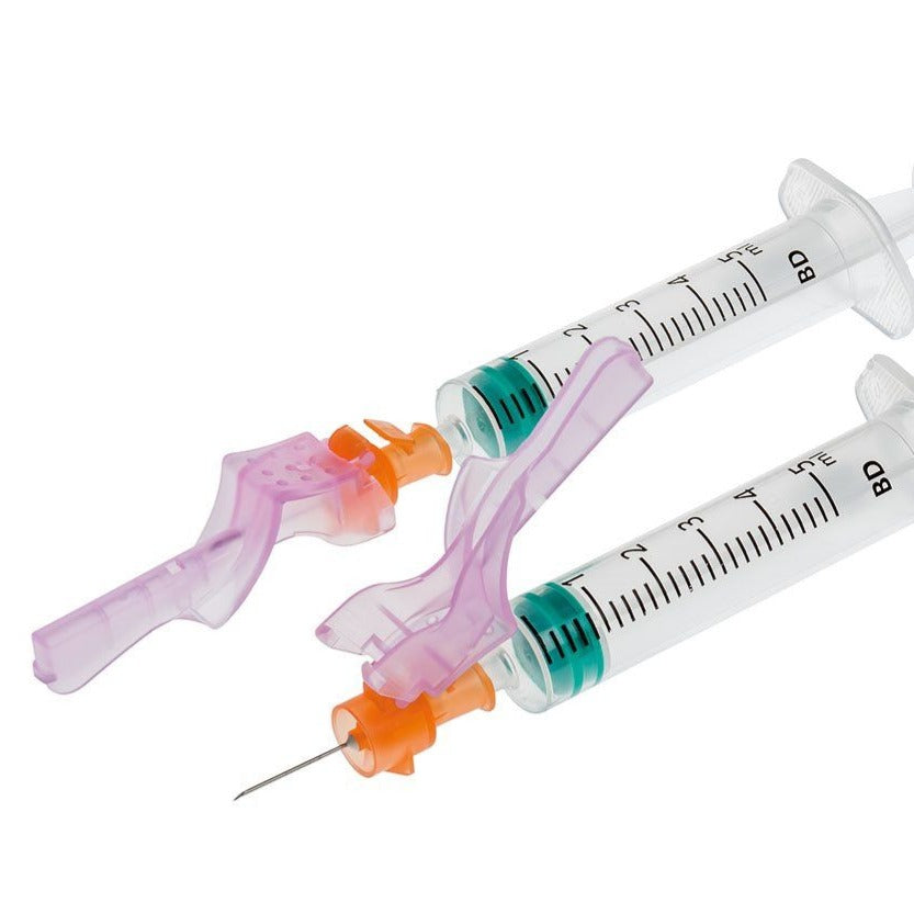 Sicherheitsinjektionskanüle mit geriffelte, ergonomisch geformter Griffplatte und integriertem Schutzschild mit Einrastmechanismus, der mit einer Hand ausgelöst werden kann. Sterile Verpackung, PVC- und latexfrei. Größe: 22 G, 5/8“, Ø Außen: 0,5 mm, Länge: 16 mm, orange.