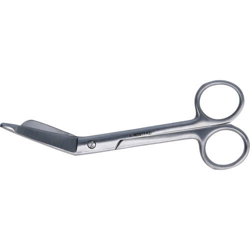 Verbandschere aus rostfreiem Edelstahl Mit ihrer speziell gebogenen Spitze erleichtert sie das sichere Schneiden von Verbänden, ohne die Haut zu verletzen. Länge: ca. 14,5 cm.