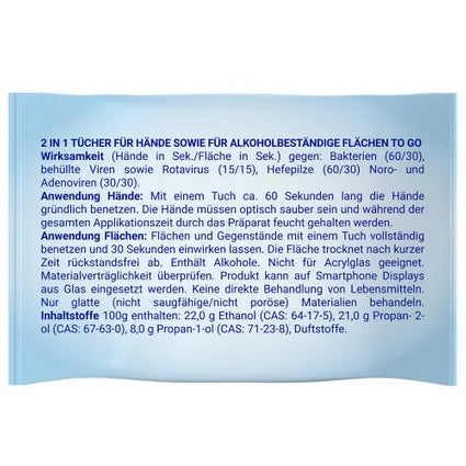Desinfektionstücher für Hände und Flächen im praktischen Format für unterwegs. Sie beseitigen 99,99% der Bakterien, Hefepilze und speziellen Viren. Mit angenehm frischem Duft.