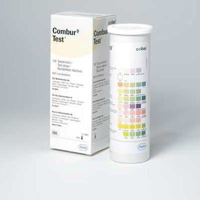 Urin-Teststreifen zur Bestimmung von Glucose, Eiweiß, pH-Wert, Nitrit, Keton, Urobilinogen, Bilirubin, Blut und Leukozyten. Die Farbe des Detektionspads des Streifens wird mit der Farbskala auf der Teststreifenbehälter verglichen. Messdauer: 60 – 120 Sekunden.