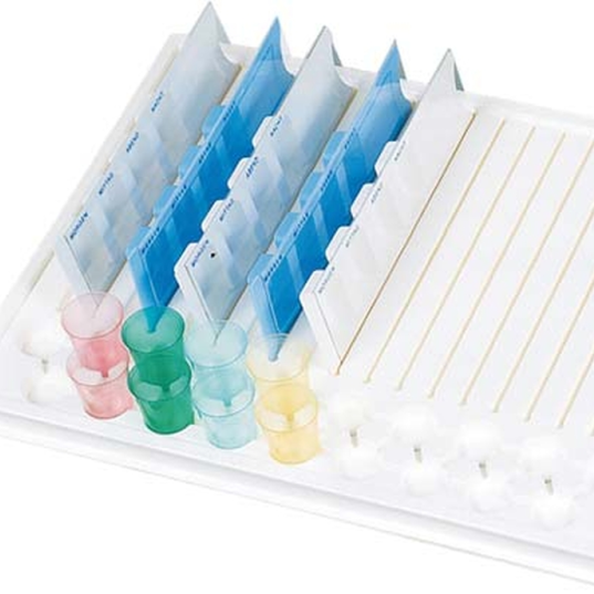 Medikamententablett aus Kunststoff für 19 Einnehmebecher und Tages-Dispenser. Maße: 43 x 33 cm, weiß.