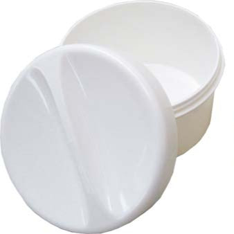 Prothesenbehälter aus Kunststoff mit herausnehmbarem Sieb und Schraubdeckel, weiß.